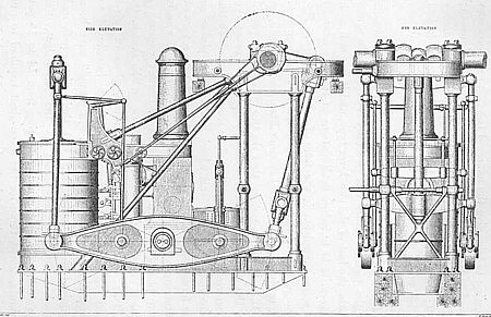 The design of the side-lever engine being fairly suitable for the paddle-wheels was generally retained down to the S/S Scotia, the last of the side-lever type, and it was still such a favorite as to induce modifications of it being retained for screw propulsion in the form of a beam-engine. The arrangement of this type is illustrated by the diagram of the engines of the Cunard steamer S/S Etna, built in 1855: