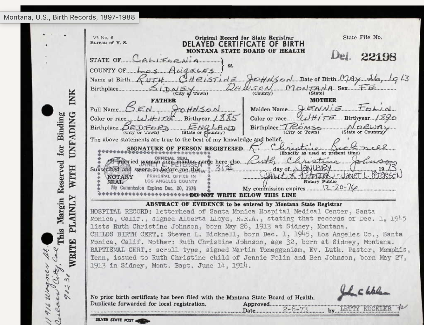 This certificate for Ruth Christine Johnson was made on 31 Jan 1973 and approved on 6 Feb 1973. She was baptized at a Missouri Synod church, Trinity in Sidney, Montana on 14 June 1914. It was apparently sent to 11916 Wagner St in Culver City.